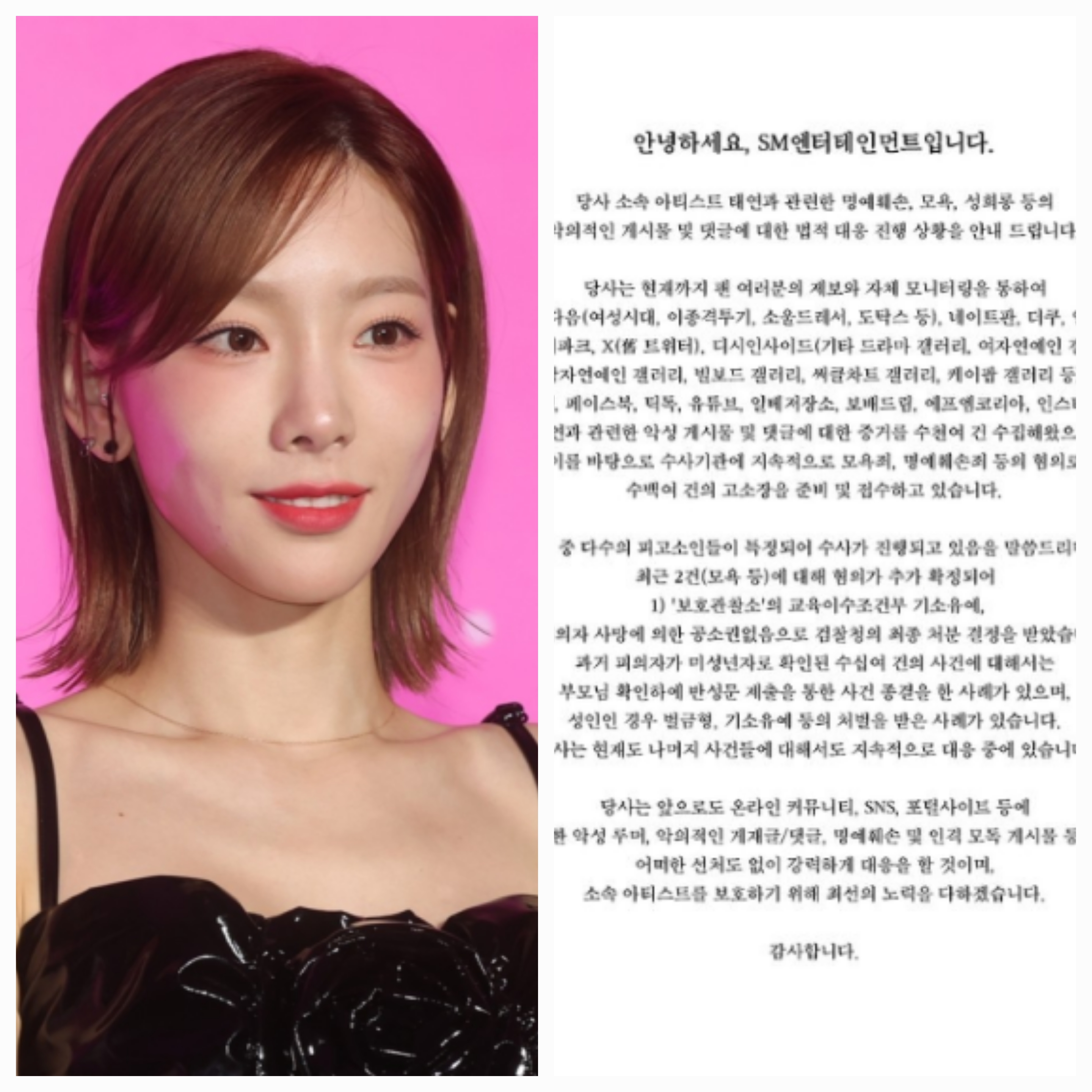 최근 두 건(모욕 등)에 대해 혐의가 추가 확정돼 ▲보호관찰소의 교육이수조건부 기소유예 ▲피의자 사망에 의한 공소권없음으로 검찰청이 최종 처분했다. 과거 피의자가 미성년자로 확인된 수십여 건의 사건에 대해서는 부모 확인하에 반성문 제출을 통한 사건 종결을 한 사례가 있다. 성인은 벌금형, 기소유에 등의 처벌을 받은 사례다.SM은 "당사는 앞으로도 온라인 커뮤니티, SNS, 포털사이트 등에 태연에 대한 악성 루머, 악의적인 게재글·댓글, 명예훼손 및 인격 모독 게시물 등에 대해 어떠한 선처도 없이 강력하게 대응을 할 것이며, 소속 아티스트를 보호하기 위해 최선의 노력을 다하겠다"고 경고했습니다